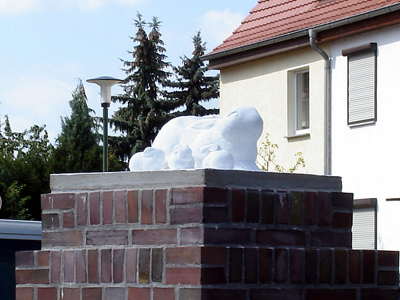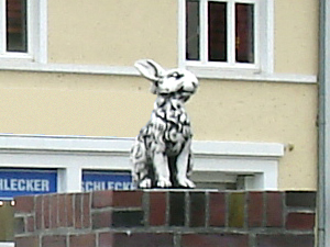 der Hasenplastik auf der Mauer vor dem Parkplatz genutzt.